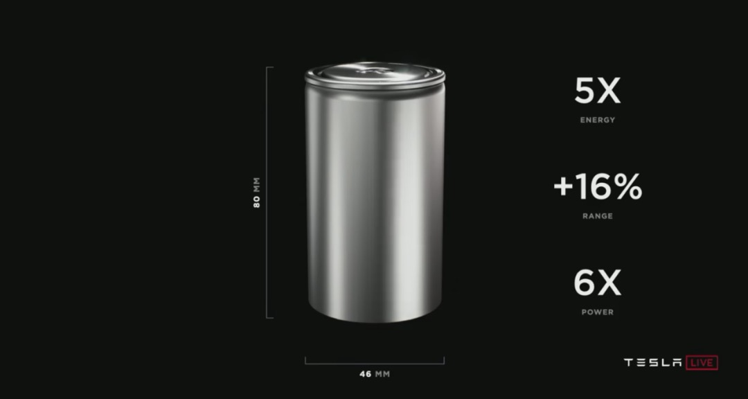 特斯拉对“无极耳电池”新技术的指标提升总结是:5倍电能提升、6倍充放电功率和续航里程提升16%。同时,PPT上图片也官宣了新款电池的尺寸和名字,因直径46mm,高80mm,故命名为4680。
