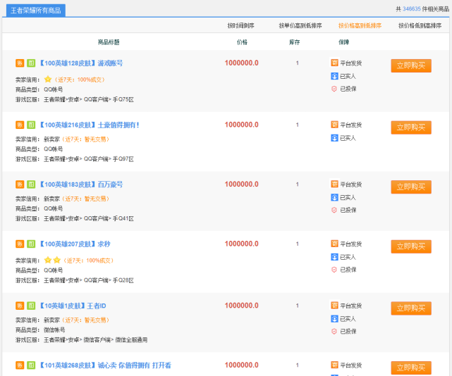 据淘手游的公开数据,2019年12月仅王者荣耀的账号交易额就达到765万元,订单数量超1万笔。而账号的价值也高低错落,在交易猫平台中梦幻西游的一个账号最高售价为12万,王者荣耀更是存在数个标价100万的账号。