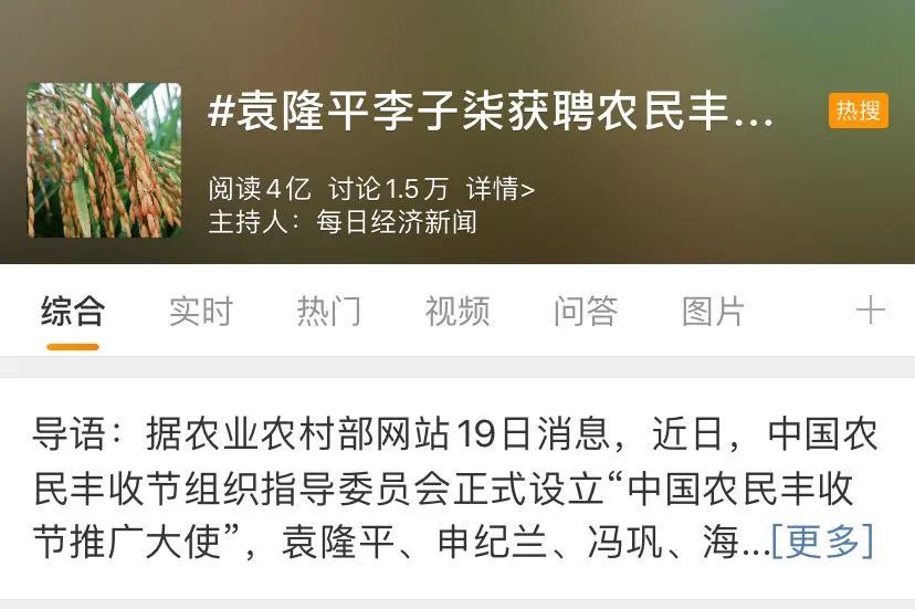 早在今年5月,#袁隆平李子柒获聘农民丰收节推广大使#的话题便空降微博热搜,为这场活动成功造势。“杂交水稻之父”和“网络人气博主”的破次元同屏,更是掀起网友热议:李子柒能不能做农民节的推广大使?