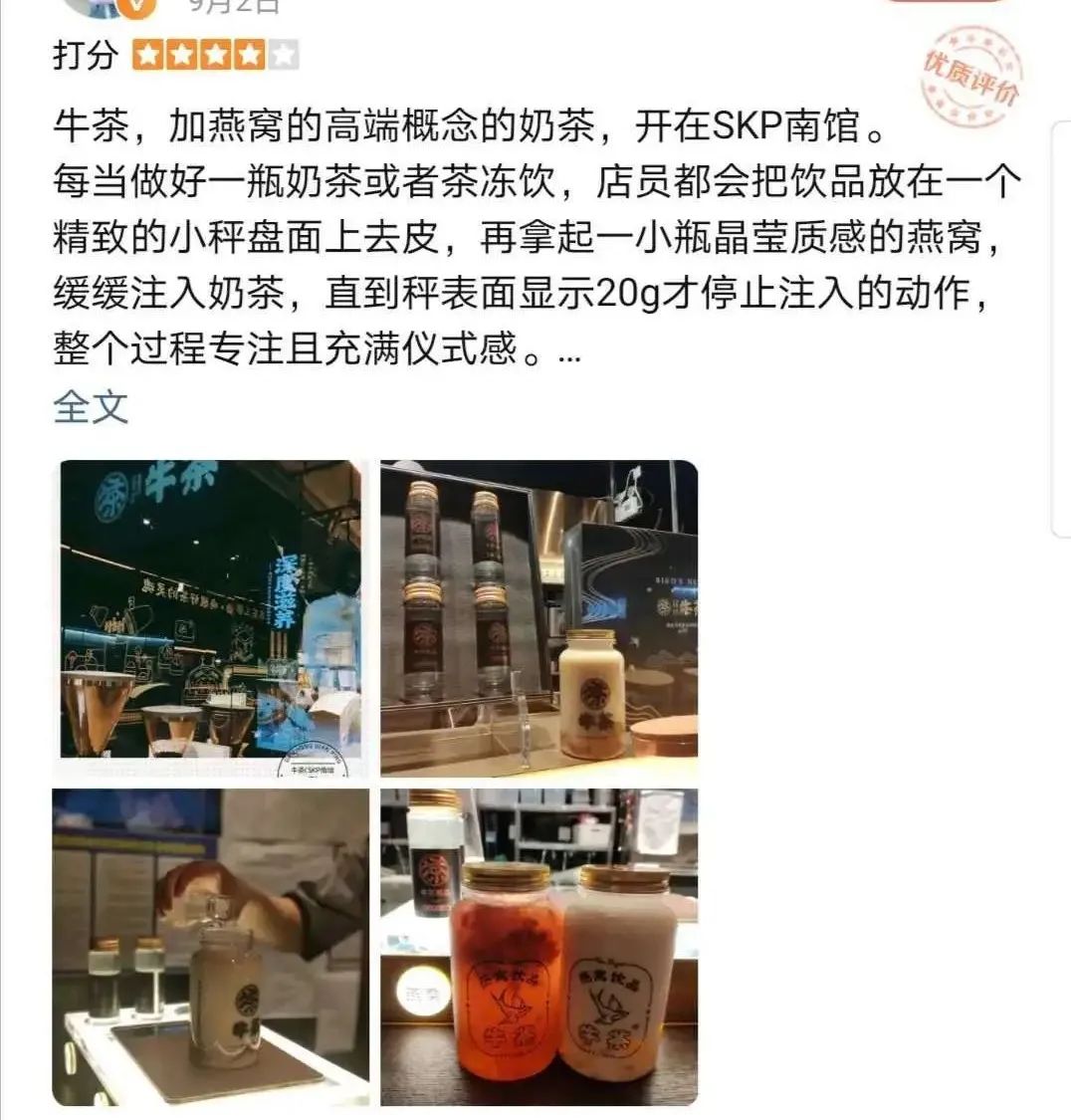 以北京牛茶的燕窝桂花奶茶为例,以马来西亚燕窝、桂花乌龙茶底、桂花茶冻、奶制品为主。