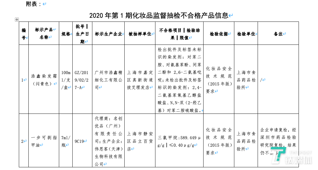 据了解,上海市食品药品检验所检验出上述结果后,企业申请复检,经深圳市药品检验研究院复检,结果仍不合格。上海市药监局表示,各相关区市场监管局已依法对不合格产品采取控制措施,要求企业暂停生产销售、及时召回不合格产品,并对相应生产经营企业开展调查处置。同时,要求被抽样单位严格按照《化妆品生产经营企业索证索票和台账管理规定》,进一步加强质量管理,确保经营产品质量安全可追溯。