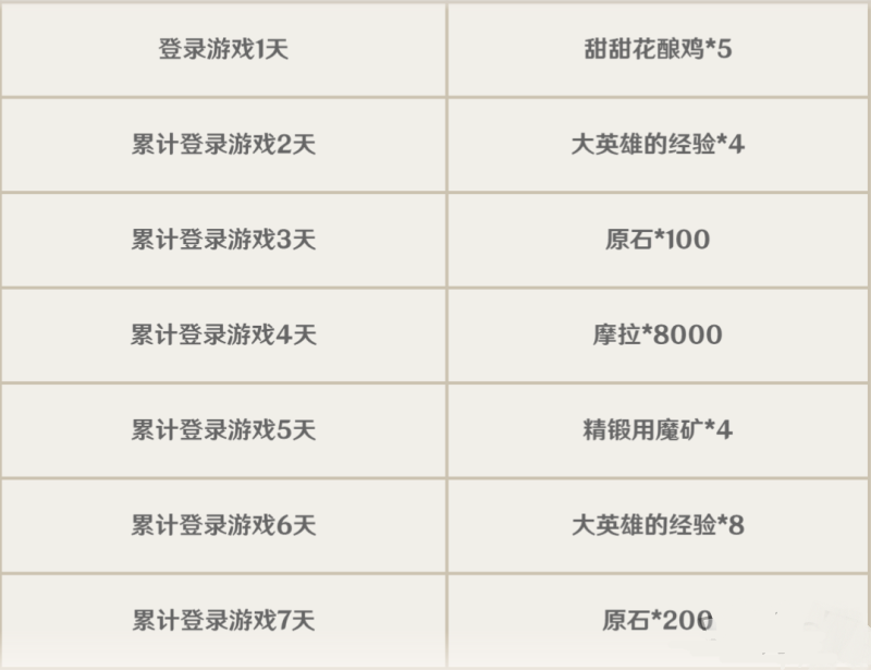 《原神》全服累计预约突破千万时,曾发放“3发十连”,而“全球同步公测”的发放奖励,则是首日“甜甜花酿鸡”(回血道具),次日、六日经验书x12(升一级),三日、七日原石x300(目前一抽160),四日摩拉x8000(后期动辄消耗几十万)。