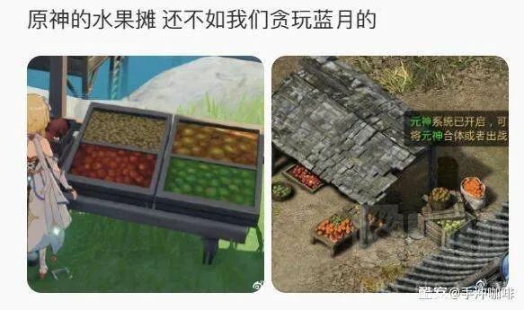再比如,某位热心玩家放出了一张游戏中的水果摊截图,然后“好心”地和某传奇品类游戏进行了对比,发现两者相差无几。当然,后来也有其他玩家放出更多优质截图,表示这是特殊情况。