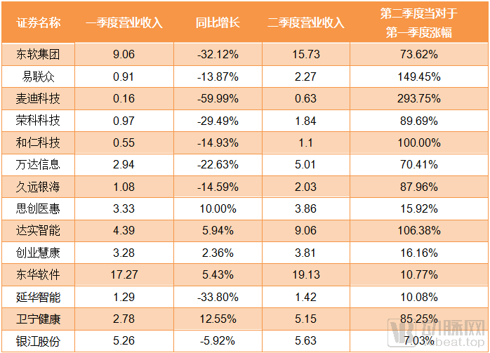 从下图可以看出,各企业第二季度的营收变化,所有企业的第二季度营收均高于第一季度,且多家企业的增幅多达一倍,疫情期的影响正被随着而来的信息化建设高潮所稀释。