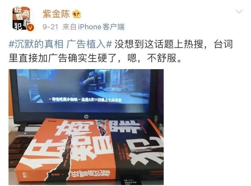“剧是好剧,绝对撑得起9分+。只是刚看第一集的时候,开局5分钟,正在地铁里紧张对峙呢,突然出来一段广告打破情绪,我都愣了一下。”有观众如此吐槽。到最后,原著作者紫金陈也亲自下场吐槽:“台词里直接加广告确实生硬了,不舒服。”