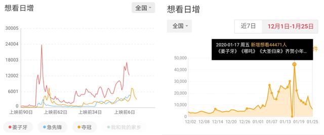 从转化率也可以看出,以目前想看人数最多的《姜子牙》为例,猫眼数据显示,该片物料播放量最多的三支短片,均是在春节档之前发布。而在其想看日增人数上,近一个月的日增量相对平稳,且大多在1万以下,相比春节档之前,《姜子牙》的日增峰值一度达到4万以上。相似的现象同样出现在《夺冠》和《急先锋》的日增曲线中。