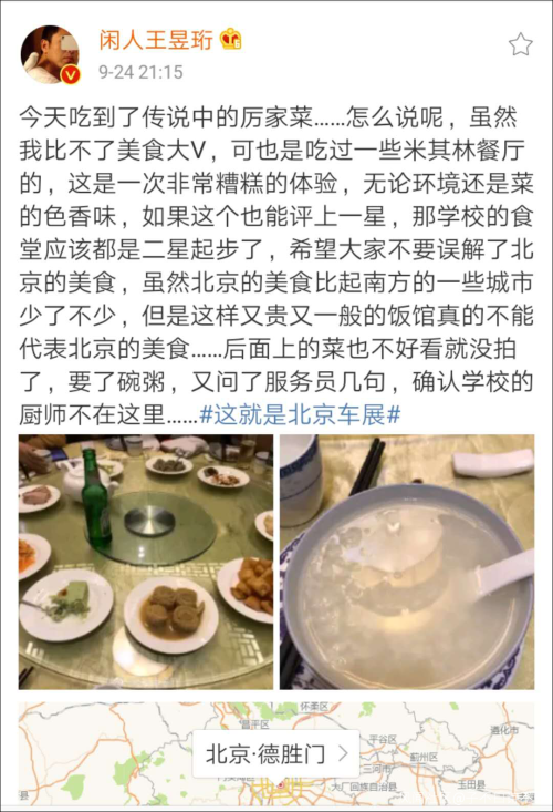 近日,综艺节目《最强大脑》人气选手王昱珩在内的一众微博大V纷纷发博吐槽,称在北京德胜门厉家菜总店的用餐体验“非常糟糕”,色香味“不及格”,环境“一般”,“如果这个也能评上米其林一星,那学校的食堂应该都是二星起步了”。