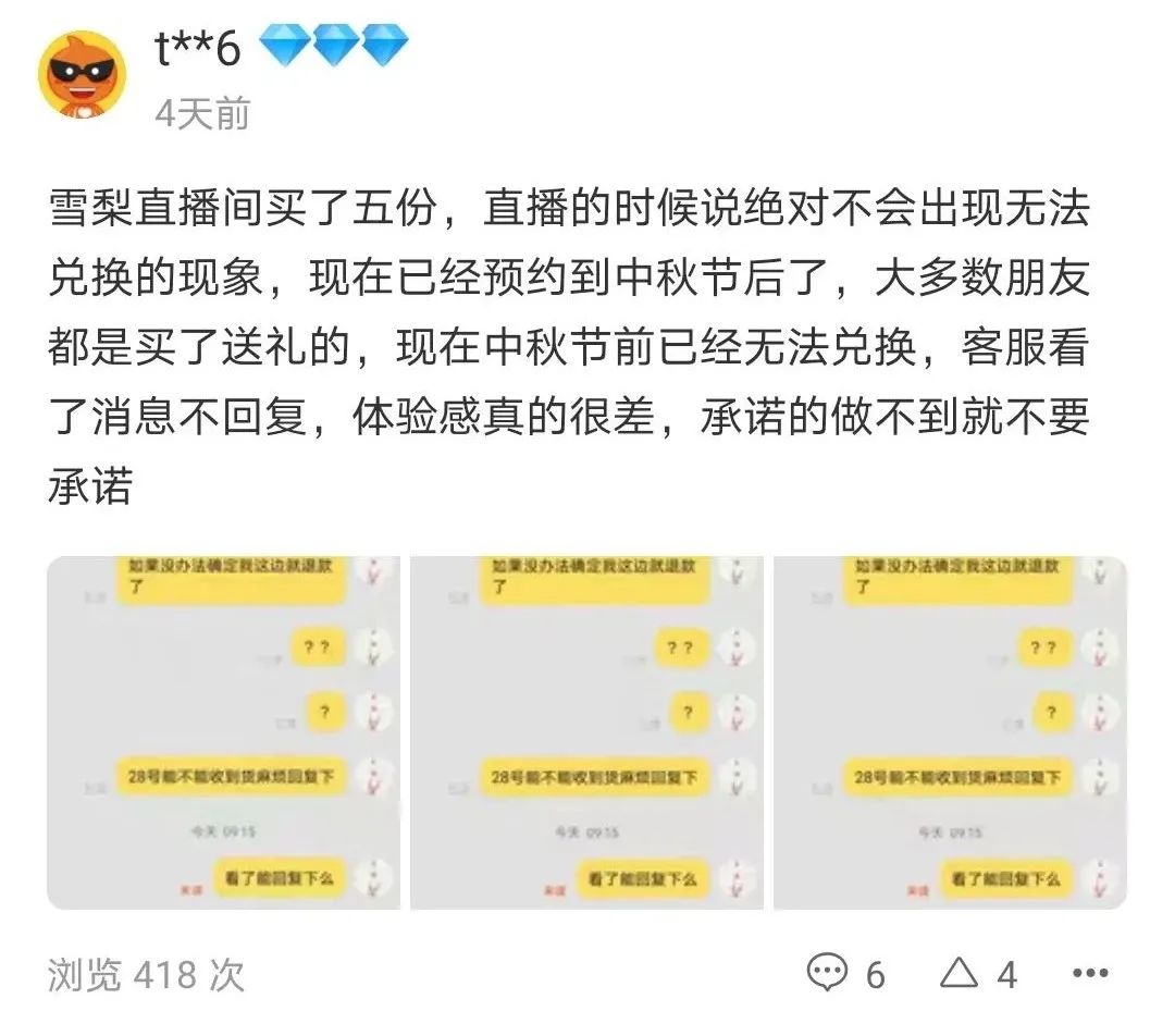 然而“网红”背后,却是无法正常发货的代价。在天猫蟹太太旗舰店,不少网友评价:“页面和卡上都没说国庆不发货,预约才发现不发货”,“直播时说绝对不会出现无法兑换的现象,现在已经预约到中秋节后了”,“短信验证码一直收不到,无法提货”。