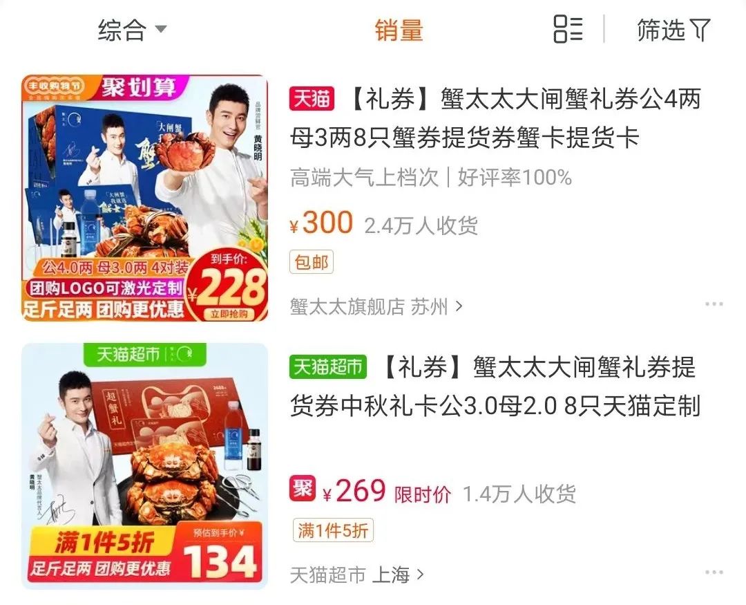 在淘宝搜索“蟹券”,售价228元的蟹太太旗舰店的一款蟹券销量排名第一,总计2.4万人收货。粗略估计,淘宝蟹太太收货总人数超过7万。