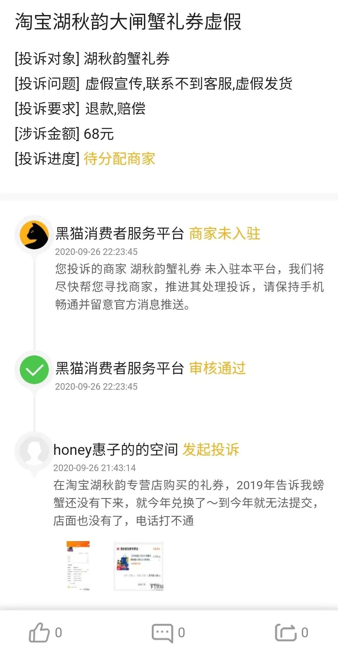 “在‘淘宝湖秋韵专营店’购买的礼券,2019年告诉我螃蟹还没有下来,到今年就无法提交,店面也没有了,电话打不通。”消费者王小姐(化名)的投诉非常典型。
