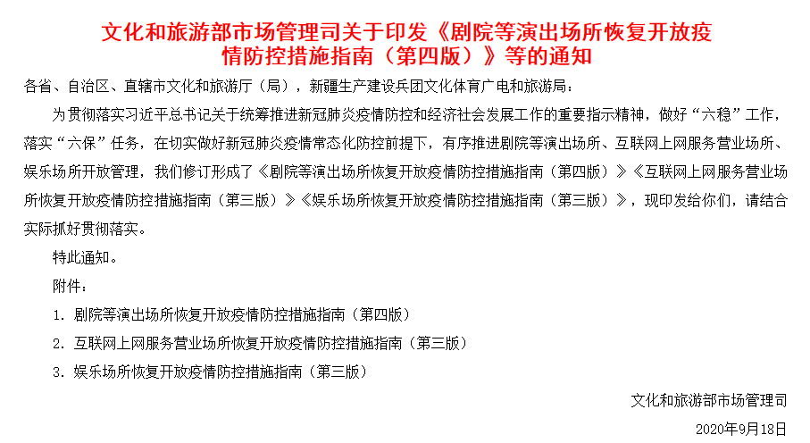 9月18日,文化和旅游部市场管理司印发《剧院等演出场所恢复开放疫情防控措施指南(第四版)》。通知显示新冠肺炎疫情低风险地区,经当地党委、政府同意,可以举办营业性演出活动。剧院等演出场所观众人数原则上不得超过剧院座位数的75%。