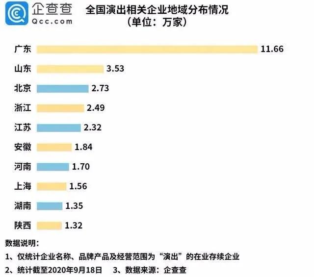 或可从演出相关企业的数据做一观察,企查查数据显示,目前我国共有45万家演出相关企业,今年4月份以来,演出市场二季度新增企业达3.2万家,同比增长13%。从地区分布来看,广东、山东、北京新增数位列前三。而新注册的企业74%注册资本低于500万,为中小型公司。