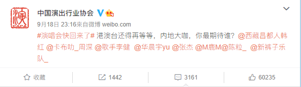 这成为推动演出市场回温最直接的利好。就在当晚,中国演出行业协会官博发帖,暗示演唱会快回来了,询问网友“港澳台还得再等等,内地大咖,你最期待谁?”,并@了韩红、周深、李健、华晨宇、张杰等一批音乐人,很是吸引了一波关注。