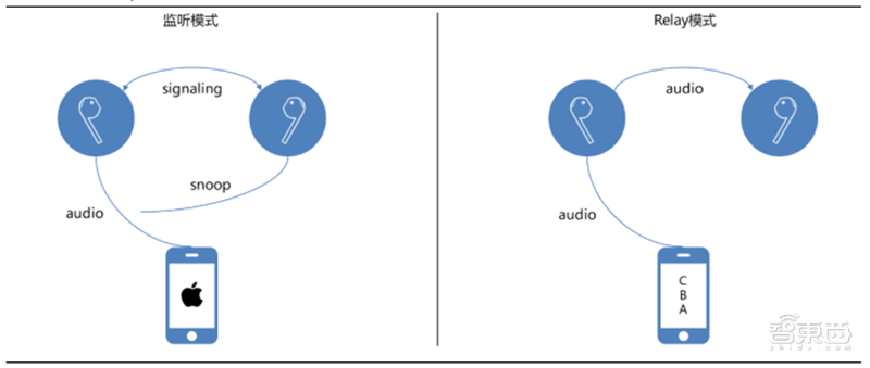 资料显示,得益于搭载的苹果W1芯片,AirPods采用了“Snoop监听模式”,即“左右耳一起听”的接收模式,苹果也对这一监听模式申请了专利保护。而早期其他品牌的真无线耳机主要采用“Relay转发模式”,即“设备–左耳–右耳”的接收模式,这也使得其相比AirPods在连接稳定性和延迟性上存在较大差距,例如可能出现的只有单耳出声的状况。