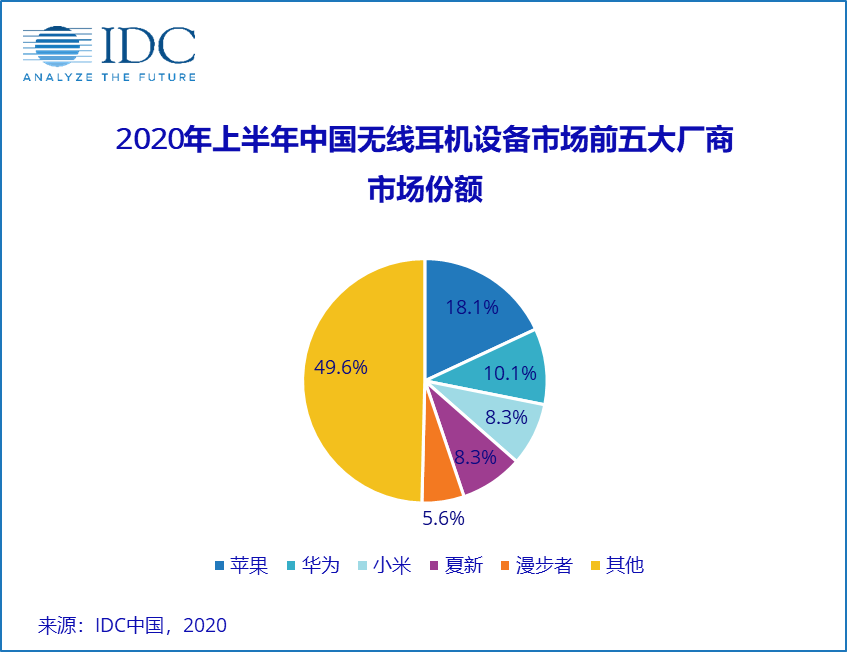 中国真无线耳机市场中,以“白牌”为代表的其他厂商占据半壁江山,苹果、华为、小米、夏新和漫步者这五大品牌则瓜分余下五成份额,领头羊的苹果也只拥有18.1%的份额。