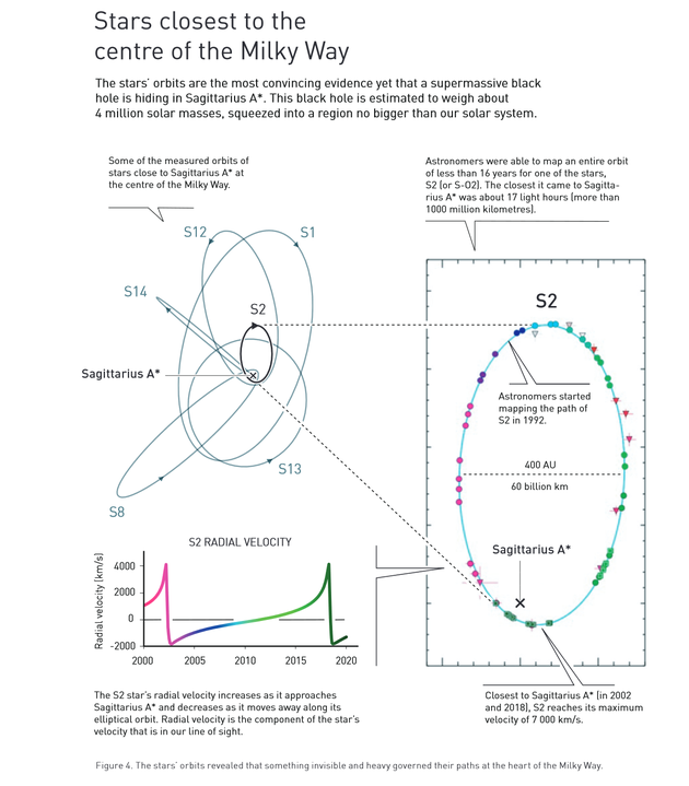 左上:天文学家测量了银河系中心人马座A*附近一些恒星的轨道;右上:对其中一颗恒星S2(或称S-02),天文学家成功绘制了其完整的轨道,发现其围绕银河系中心的周期不到16年。该恒星最靠近人马座A*时,距离仅为大约17光时(100亿公里以上)。左下:S2的径向速度会随着其接近人马座A*而增加,并随其在椭圆形轨道上的运行而逐渐下降。径向速度是恒星速度在我们视线上的分量。右下:在最靠近人马座A*(2002年和2018年)时,恒星S2的速度达到最高的每秒7000公里。