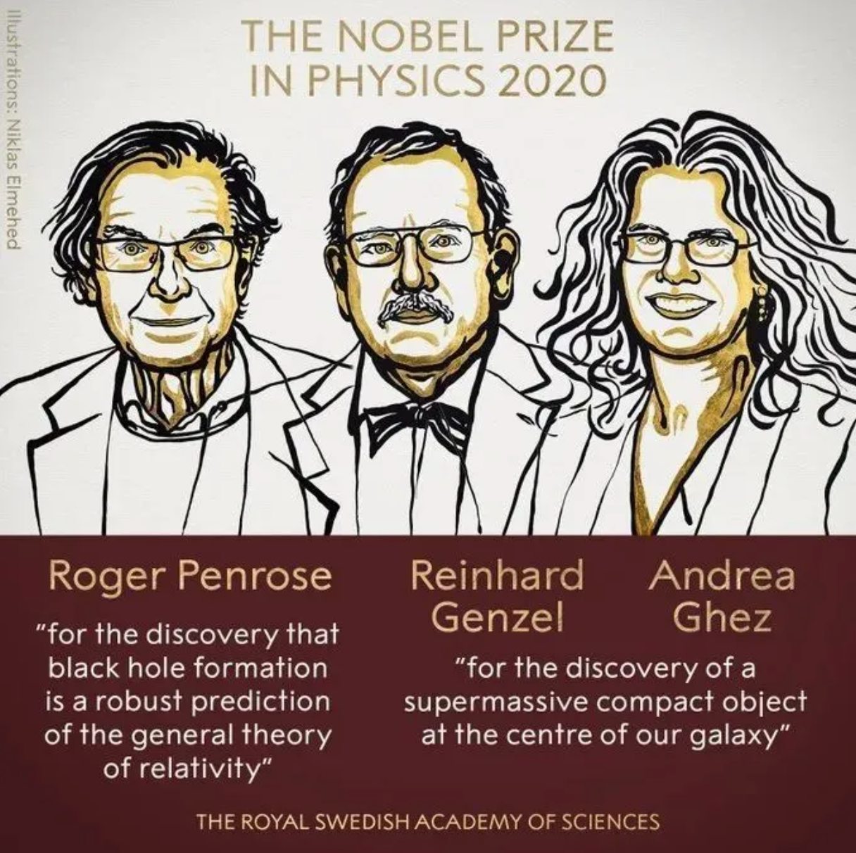 2020年诺贝尔物理学奖揭晓:一半授予Roger Penrose,获奖原因“发现广义相对论预测了黑洞的形成”;另一半授予Reinhard Genzel和Andrea Ghez,获奖原因“发现银河系中心的超大致密物体”。三位物理学家分享了今年的诺贝尔物理学奖,因为他们发现了宇宙中最奇异的现象之一——黑洞。