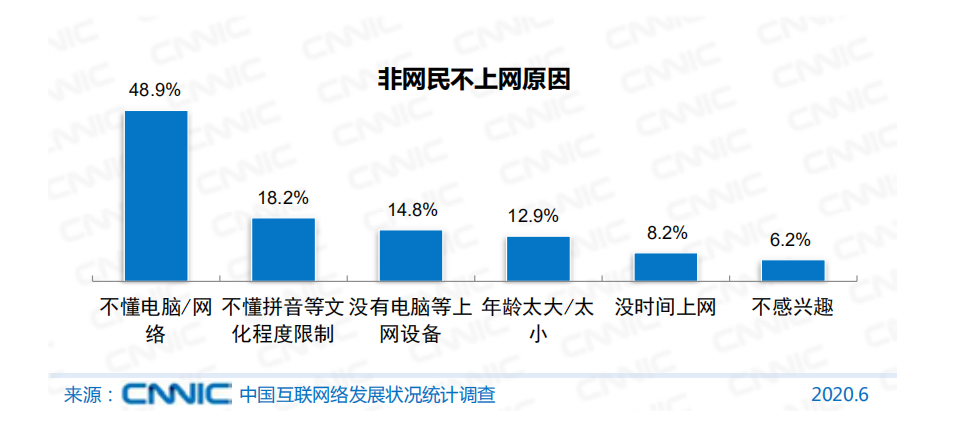 中国互联网络信息中心(CNNIC)发布的第46次《中国互联网络发展状况统计报告》(下文简称《报告》)显示,截至2020年6月,我国网民规模为9.40亿,其中50岁及以上网民群体占比由2020年3月的16.9%提升至22.8%。互联网正在进一步向中高龄人群渗透,但他们之中,依然有相当一部分人,被这个日益数字化、智能化的世界抛在了身后。