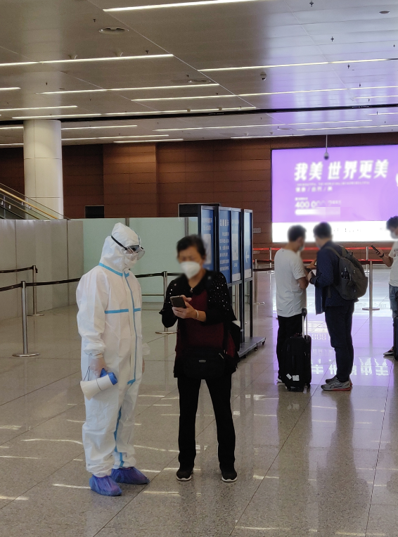 一位旅客正在向机场工作人员请教如何扫码登记,图/新浪科技