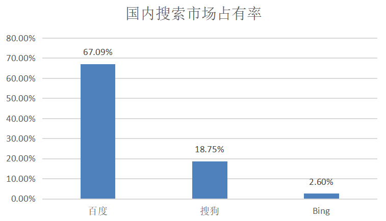 据statcounter统计,截至到2019年12月,百度在国内搜索市场的占有率为67.09%,牢牢占据着“一哥”的位置,第二名为搜狗搜索,占有率为18.75%,Bing的占有率仅有2.6%,处于边缘化的位置。