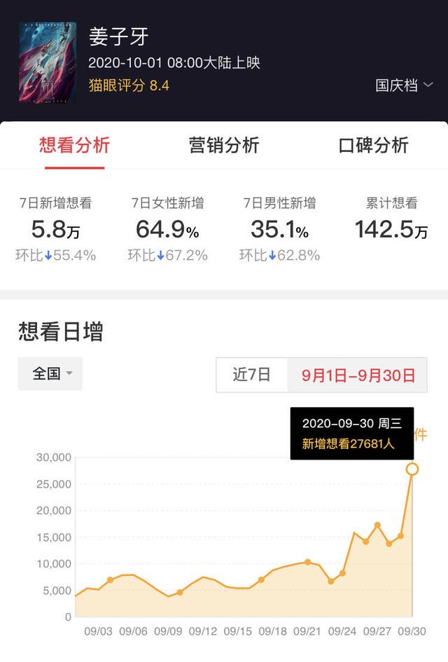作为春节档遗留下的种子队选手,伴随着《哪吒》掀起的封神IP热潮与国漫骄傲感,《姜子牙》热度曾一骑绝尘。宣布定档国庆档之时,《姜子牙》想看指数大幅度领先,仅猫眼想看人数《姜子牙》就超过《家乡》近一百万。