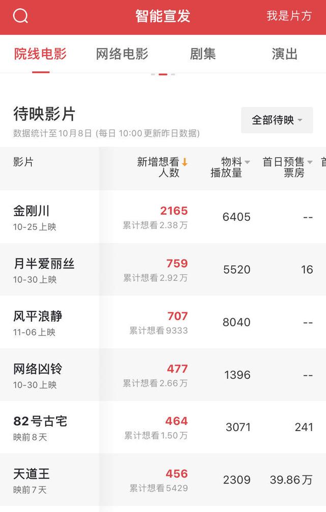 而电影市场上,国庆档之后大体量国产电影并不多。2020年春节档种子队中没有亮相的《唐人街探案3》执着的奔向了2021年春节档。10月目前关注度较高的电影是抗美援朝题材的《金刚川》,管虎、郭帆、路阳、田羽生四名导演联合执导,张译、吴京等主演,但目前猫眼想看人数2.4万,10月末则有中小体量爱情片《月半爱丽丝》。