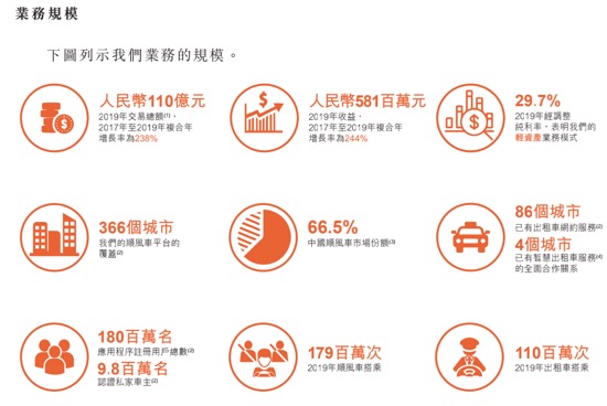 根据弗若斯特沙利文报告,2019年嘀嗒顺风车搭乘次数1.785亿次,占据66.5%的顺风车市场份额。截至2020年6月30日,嘀嗒平台注册私家车主1920万。