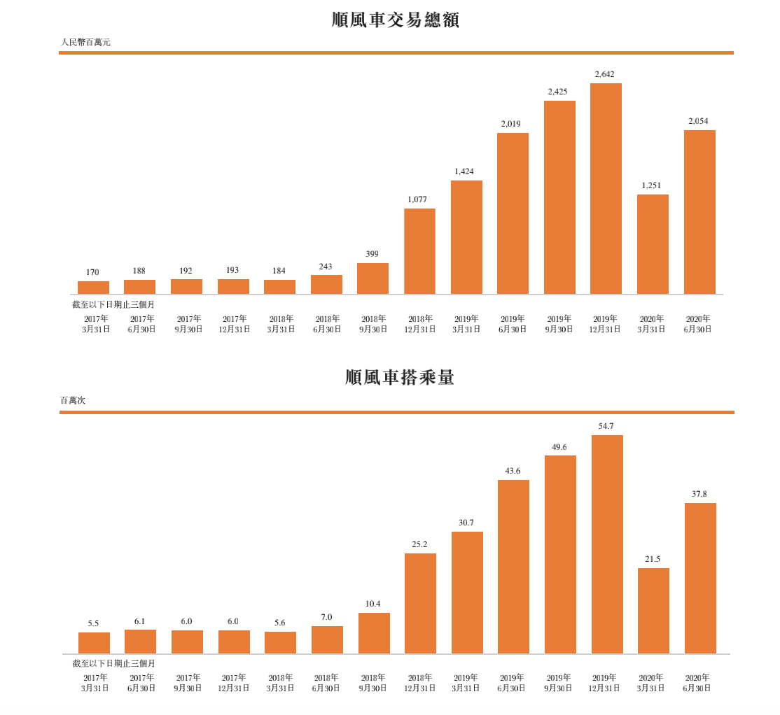招股书显示,2019 年嘀嗒平台交易总额 110 亿元人民币;其中,顺风车交易总额为 85 亿元,同比增长 347.4%。与此相应的,嘀嗒平台顺风车搭乘次数从2017年一季度的550万次增长至2019年四季度的5470万次;2020前两个季度,受疫情影响,这一数据略有下滑,分别为2150万次和3780万次。