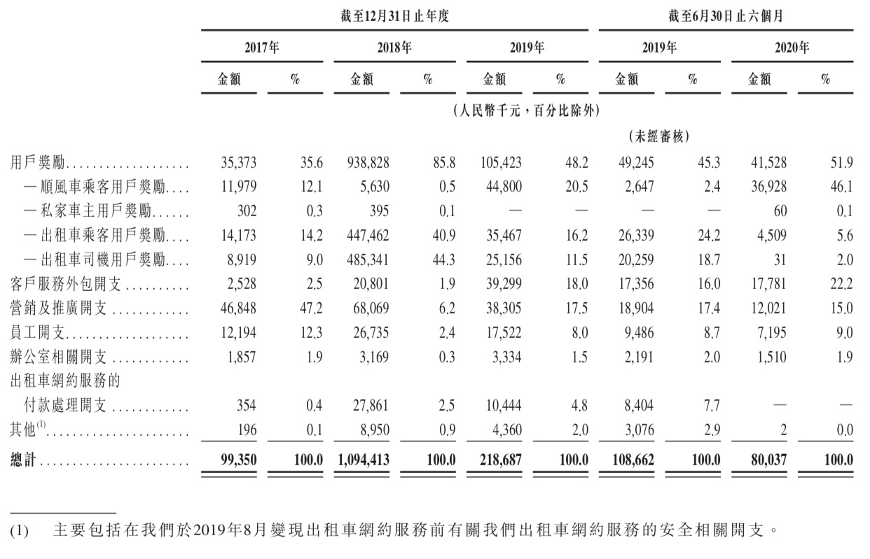 销售及营销开支主要包括顺风车乘客、私家车主、出租车乘客及出租车司机用户奖励、客户服务外包开支、营销及推广开支、员工开支、办公室相关开支、出租车网约服务的付款处理开支及其他。其中,“用户奖励”的下降尤为值得关注。