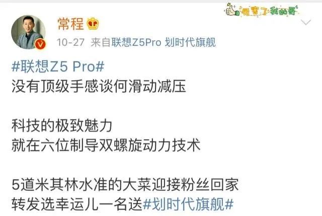 同年11月2日,联想发布Z5 Pro,也频繁碰瓷小米。当时小米手机发布了滑盖全面屏的MIX 3,被雷军调侃为“新一代的解压神器”。其后常程带着联想Z5 Pro的话题,在微博上发文:“没有顶级手感谈何滑动解压。”