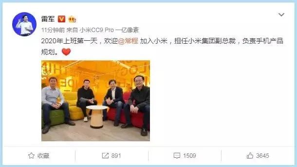 2020年1月2日,雷军在微博上宣布,前联想集团副总裁、中国区移动业务负责人常程加入小米,担任小米集团副总裁,负责手机产品规划。常程也发布了朋友圈,他提到,加入小米是最美的期待,“2020拼搏从第一天开始。”