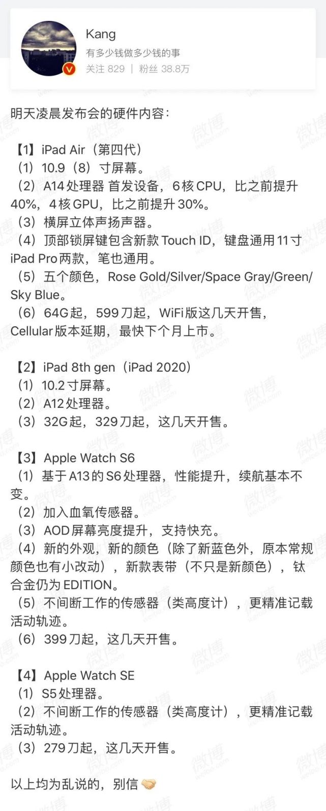 这些消息来自国内知名数码博主@Kang,从此前的爆料记录来看,此人与苹果的消息源关系非同一般,甚至能提前看到发布会的相关信息。9月份iPad发布会的具体消息,他也预测得很准。