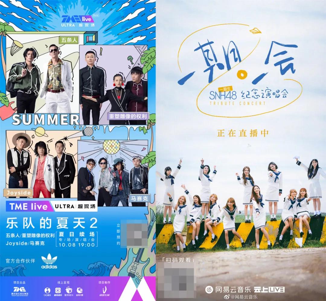 但这却不是线上演出集中排播的“档期”。国庆前后九天,腾讯音乐旗下的TMElive期间的演出安排分别是9月30日的Jessie J“时空不设限”演唱会、10月3日的陈立农生日演唱会和10月8日的乐队的夏天线上演唱会;网易云的云上live则仅安排了10月8日的SNH48“一期一会”毕业演唱会。