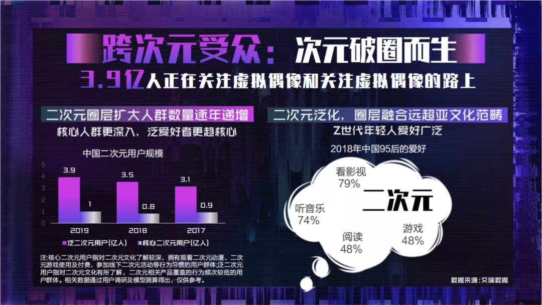 据艾瑞数据显示,2017-2019年,我国二次元用户三连升,已经达到3.9亿,核心二次元用户也达到了1亿人。与此同时,二次元不断泛化,圈层融合远超亚文化范畴,Z世代用户在二次元的渗透率,已经达到64%。