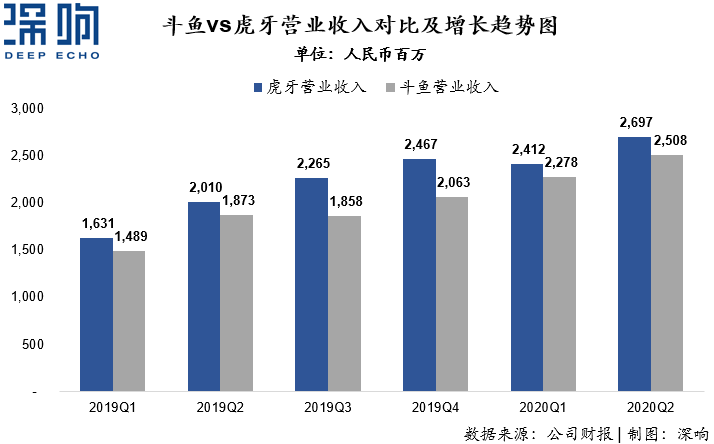 财务角度看也有一些“东边不亮西边亮”的时刻。比如斗鱼在月活跃用户数(MAU)一直长期领先于虎牙的情况下,在今年二季度被虎牙反超。而斗鱼和虎牙二季度归属于各自股东净利润分别为3.4亿和3.51亿元人民币,虎牙领先斗鱼0.11亿元人民币;公司净利润率则分别为13.5%和13%,斗鱼领先虎牙0.5个百分点。