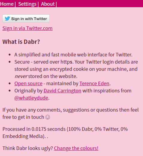 例如,有一种基于PHP语言生成的网页客户端Dabr,可以架设在任意一台私有服务器上。这样,即使Twitter的主域名遭遇攻击导致访问故障,而你自己的网站仍可正常访问,那就可以用自己的服务器来做一个桥接,来间接地访问到推特服务。