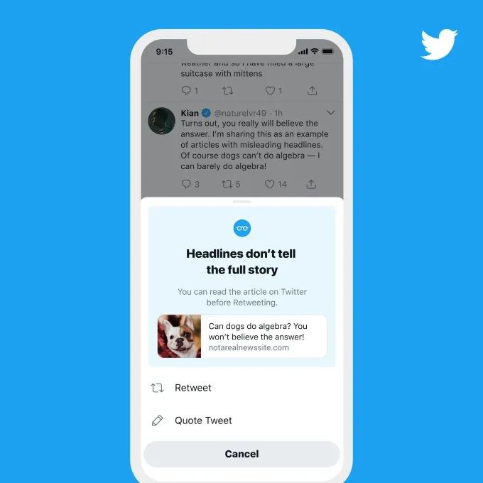推特方面表示,他们测试一个提示,让用户在转发带链接的消息之前,先花一点点时间把链接指向的文章读完。