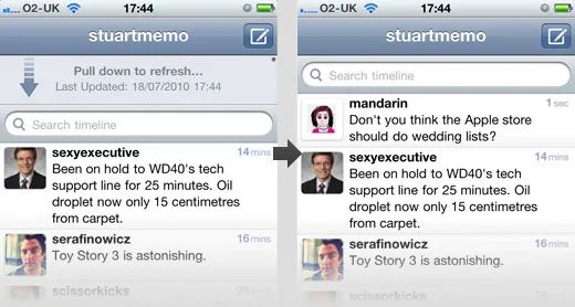 而独立开发者所做的最名垂青史的重大贡献,当属iOS客户端Tweetie发明的一种交互手段,就是大名鼎鼎的“下拉刷新”。凭借这一交互效果,Tweetie获得了2009年度的苹果iOS应用商店设计大奖。