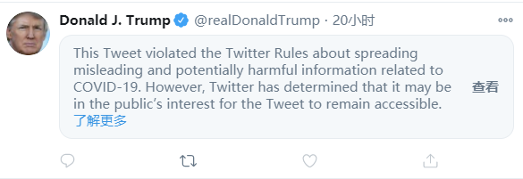 如果是美国的政治人物、候选人和竞选活动账号发布了误导消息,则政策更为严格:推文会被折叠起来,用户必须先查看警告信息,点开以后才能看到原文。这样的推文将禁用点赞、官方转推和回复功能。
