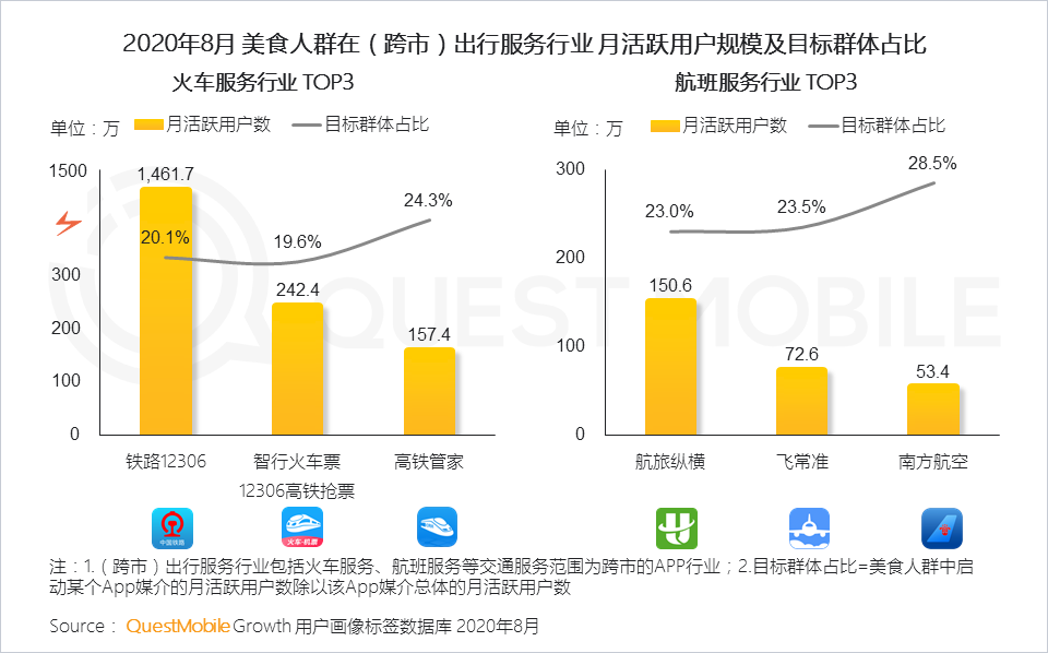 4.2 高铁已成为人们跨市出行的主要交通工具,美食人群在火车服务方面的应用需求也更高,但在航班服务用户中,美食人群占比相对更大