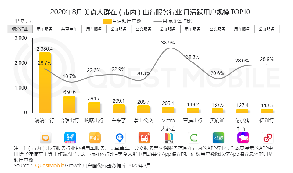 3.2 美食人群也有较高的出行服务需求,其中较常使用打车类APP,公共交通可直接使用交通卡,但在公交服务类APP用户中,美食人群依然占据较大比例
