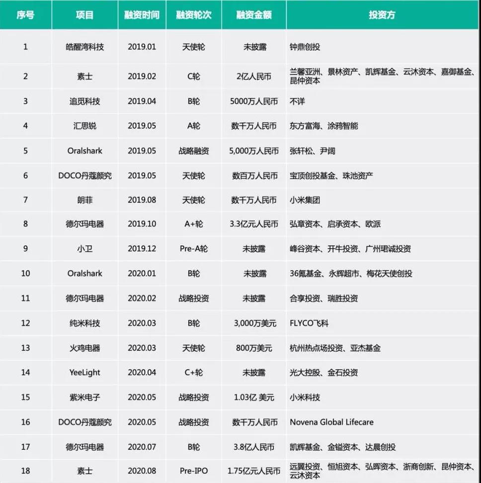 在资本市场上,小家电赛道也备受资本青睐,2019-2020年共发生18起融资事件,2020年1-8月累计有8起。除了一些传统家电品牌,新兴品牌也开始受到追捧,其中素士、Oralshark从2019年至今已分别完成2轮融资。