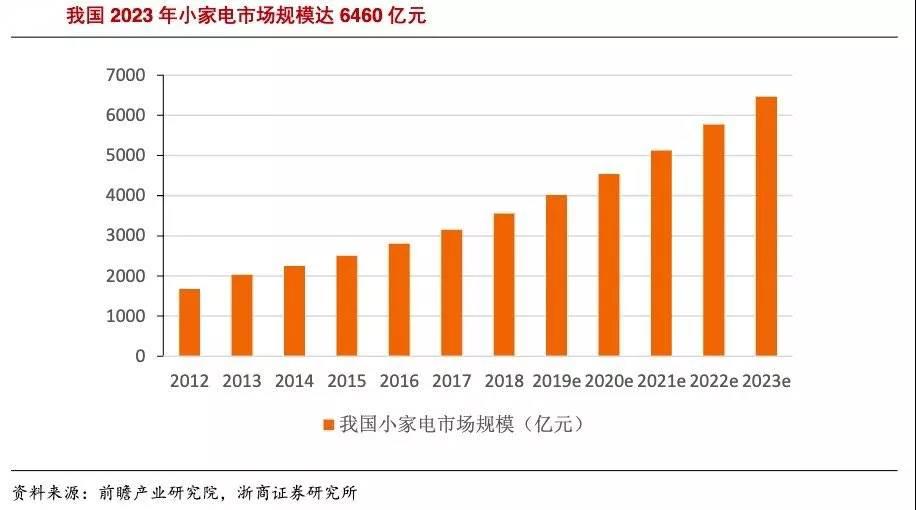 根据前瞻产业研究院统计数据显示,2012 年至2019 年小家电行业年均复合增长率为13.3%,2019年市场规模4015 亿元,并预测在2023年市场规模达到6460 亿元。