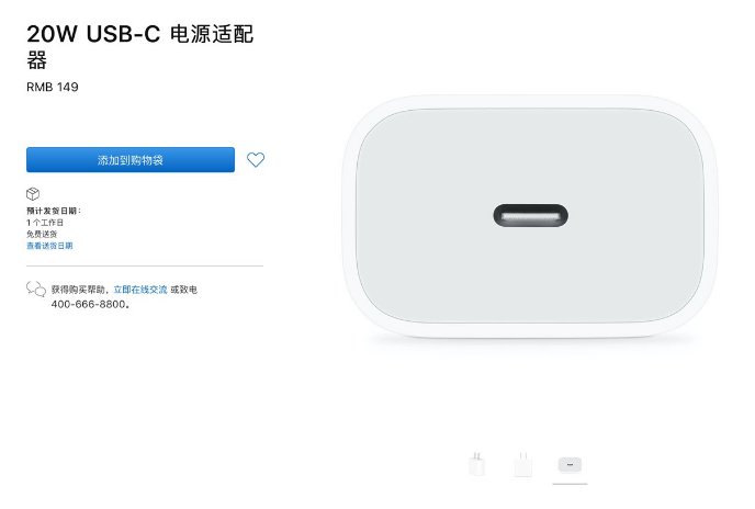 目前苹果已经开始销售 20W USB-C 电源适配器,该产品当时与新款 iPad Air 一起推出。与iPad Air 的包装盒中包含20W电源适配器不同的是,如果想要在新 iPhone 机型上使用这款适配器则需要单独购买,目前苹果官网售价149元。
