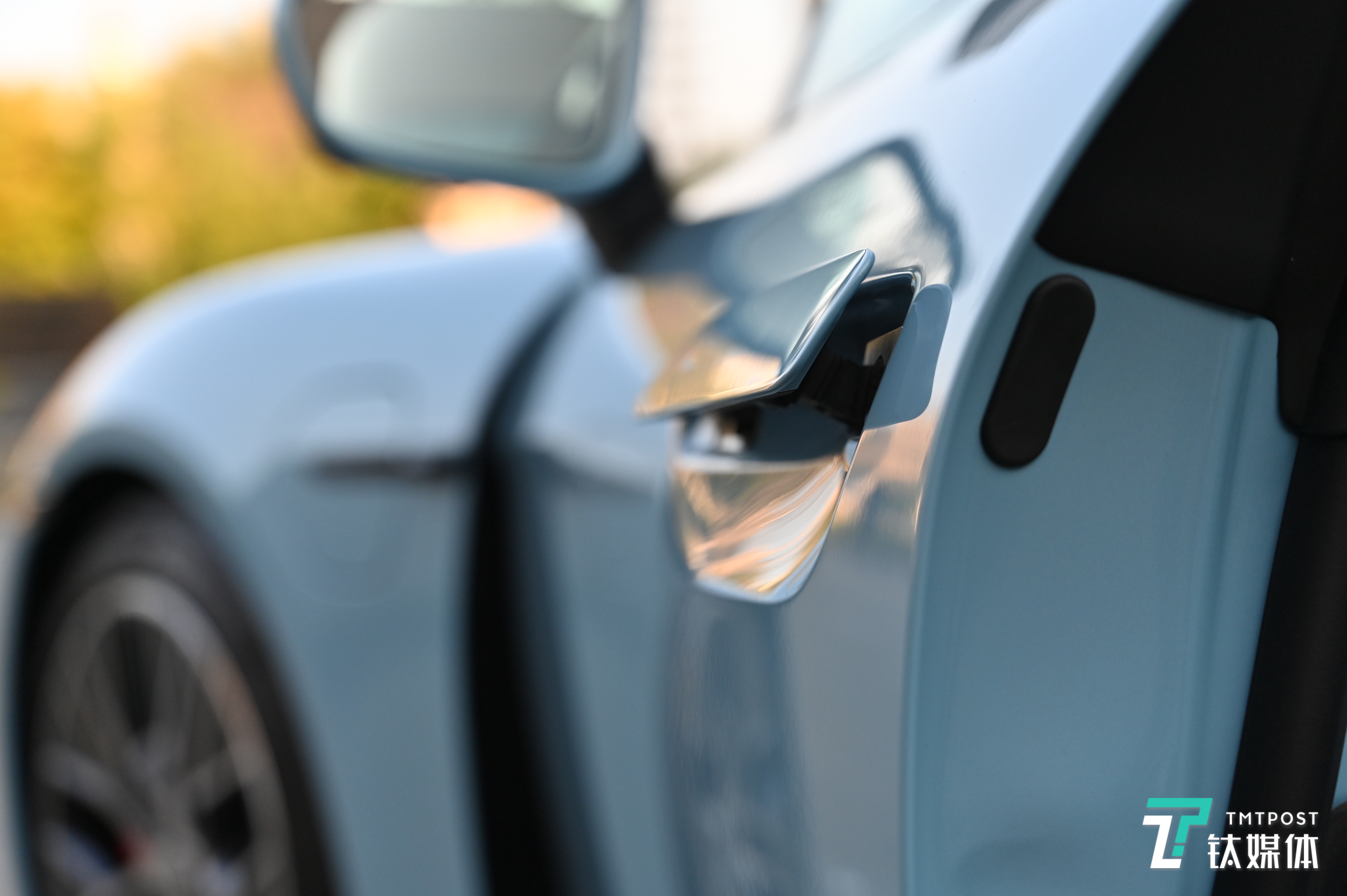 四个车门把手都采用了隐藏式设计,当贴近车身时,会自动弹起,好像现在电动车不用个隐藏式门把手,就不叫电动车一样,保时捷Taycan 4S也不能免俗,但这确实降低了风阻系数。