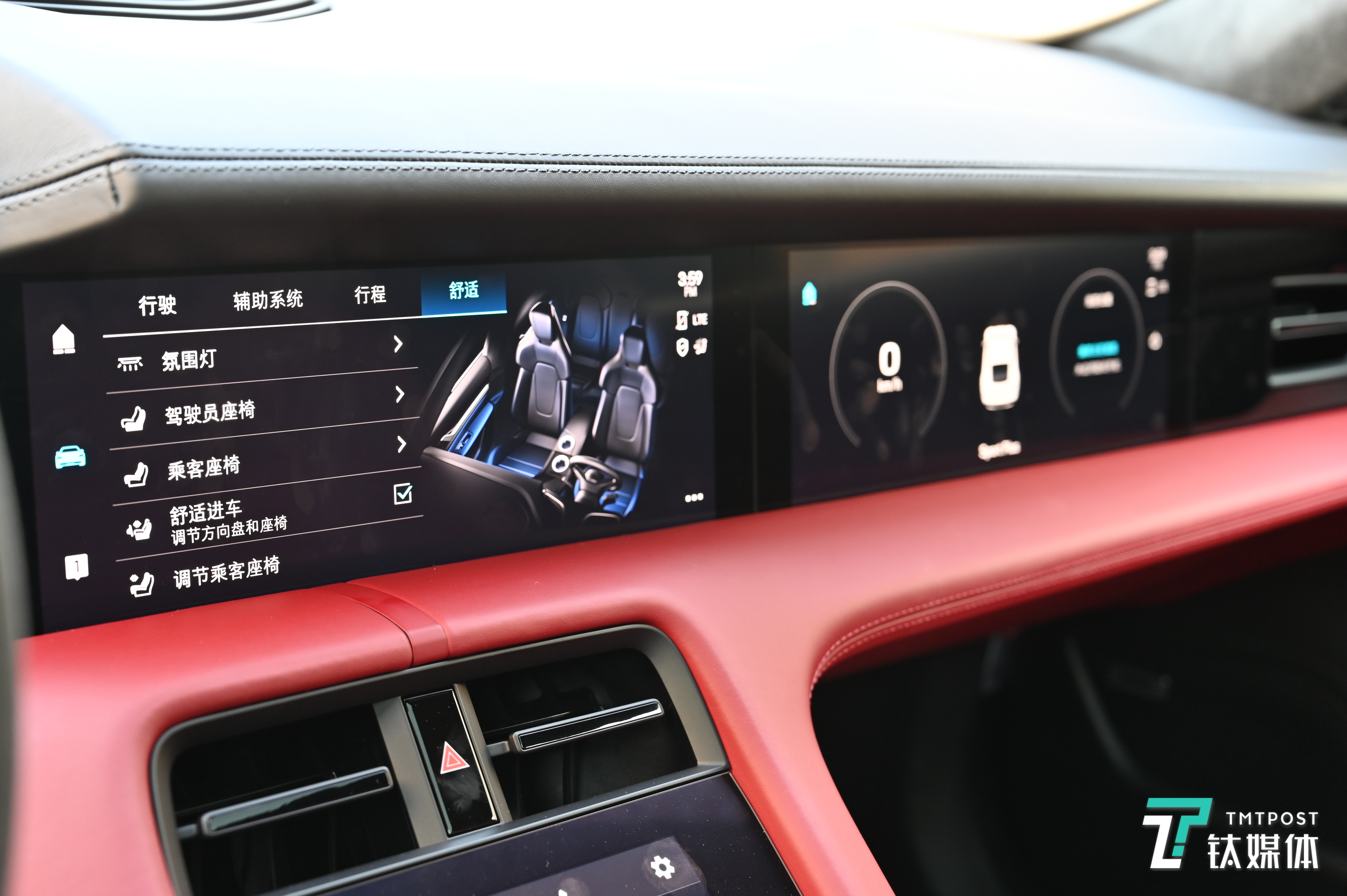 实事求是的说,这4块屏幕极大的提升了保时捷内饰的科技氛围,在加上保时捷一惯的豪华内饰搭配,坐在车内驾驶Taycan 4S绝对是一种享受。Taycan 4S支持通过说“嘿,保时捷”的方式启动语音控制系统,可以控制车内的空调温度等软件设置,但并不能控制车窗开关等硬件。在语音控制以及软件应用上,Taycan 4S还有进一步的提升空间,但想买这辆车的用户,可能也并不在乎这个问题,就好像特斯拉车主会选择无视做工接缝一样。