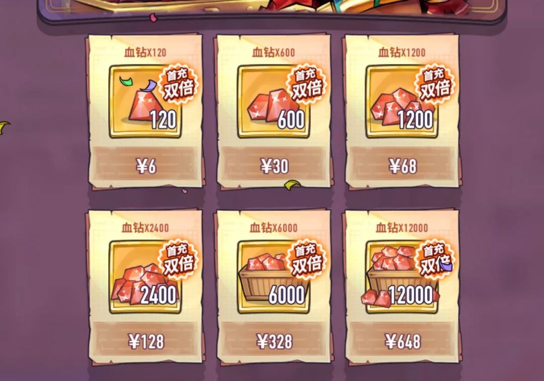 68兑换1200血钻、128兑换2400血钻、328兑换6000血钻、648兑换12000血钻。是的你没看错,它非常“贴心”的帮你把零头抹了——只不过抹的是人民币的零头。