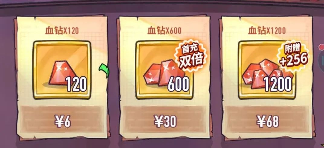6元兑换120血钻、30元兑换600血钻,前两个氪金选项明确的告诉所有人1:20的兑换比例。但从第三个选项开始,情况就不对了。