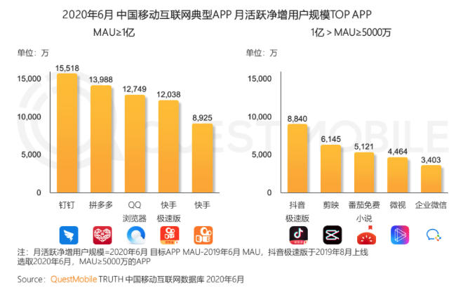 根据《QuestMobile中国移动互联网2020半年大报告》显示,2020年6月移动互联网典型APP月活净增用户规模TOP 10排名中,快手极速版净增MAU高达1.2亿,抖音极速版和字节系的剪辑软件剪映净增数量也分别高达8840万和6145万。相关数据显示,抖音极速版、剪映等产品拉动了头条系7.1%的用户增长,快手及其极速版则拉动了快手系应用41.5%的涨幅。