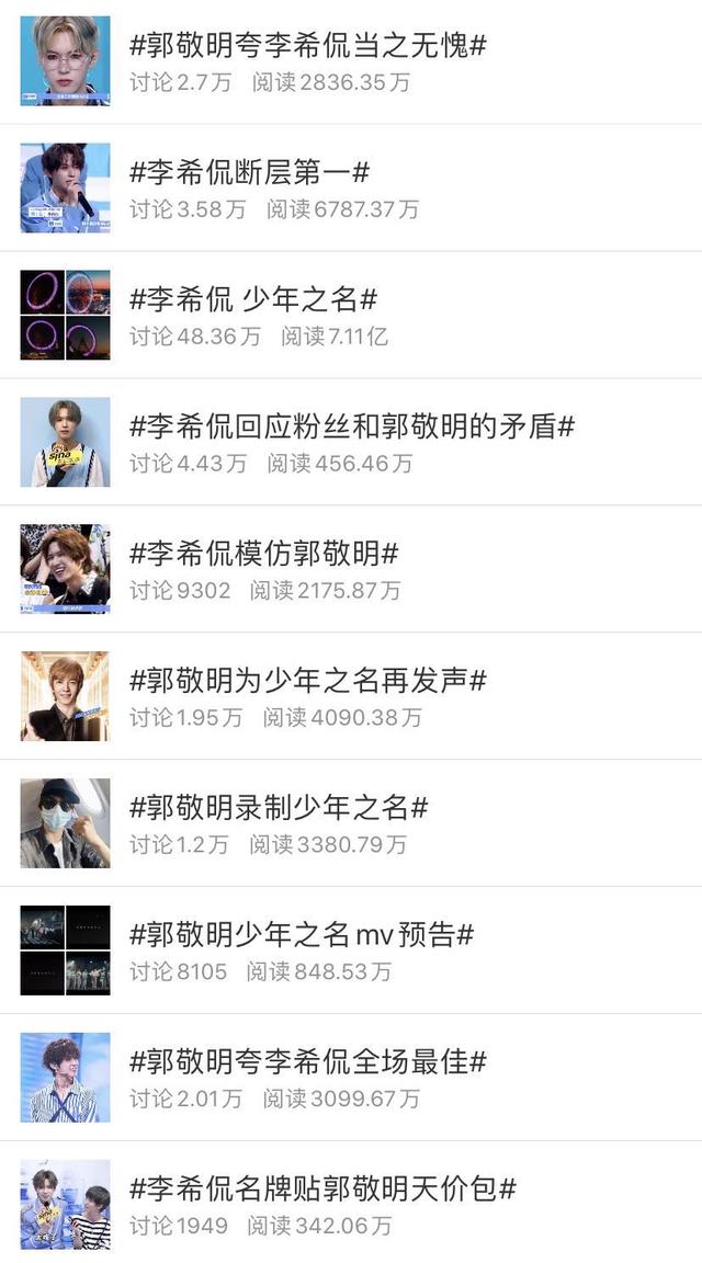 比如前段时间,郭敬明就曾凭借一己之力,将一档接近于“糊”的选秀节目《少年之名》,拉回热搜榜上。这档节目最后选出了哪位新人爱豆、做的怎么样全然不是重点,郭敬明与节目组、与李希侃之间的“相爱相杀”,才是大众热议的焦点。很多网友表示,“如果不是郭敬明,(自己)根本不知道还有这样一档小糊选秀综艺”。